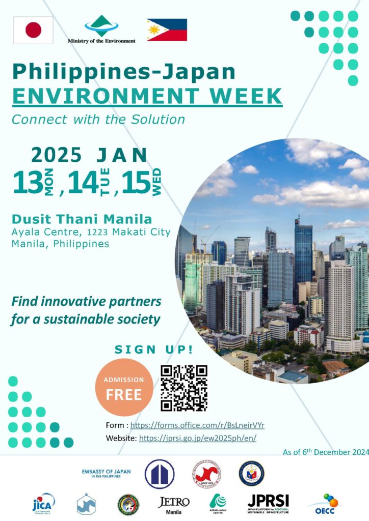 On January 14th-15th, 2025, Eight-Japan Engineering Consultants Inc. (“EJEC”) will participate in “The 2nd Philippines – Japan Environment Week” to be held in Manila, Philippines, hosted by the Ministry of the Environment, Japan. At this event, we will introduce our consulting services in the field of Waste Management.