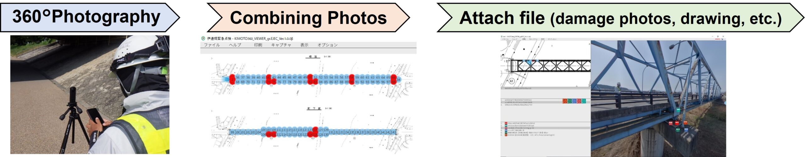 Features: - Combine 360° images with attached data for easier inspection management. - Small file size and quick processing. - Do not require Cloud connection - Damage location can be confirmed in 3D. - Various file attachments (Word, Excel, PDF, JPEG, dwg, etc.).